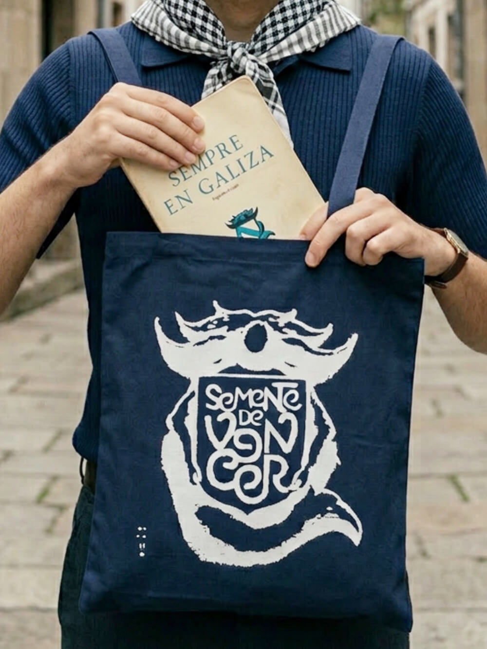 Serifrafia branca sobre tecido azul. Desenho inspirado nas palavras de ordem do movimento feminista, nos versos de Ses em “Semente de Vencer” e no antifascista Moncho Reboiras. Esta composição emoldura a frase com o Escudo de Castelao da capa do ensaio “Sempre en Galiza”.