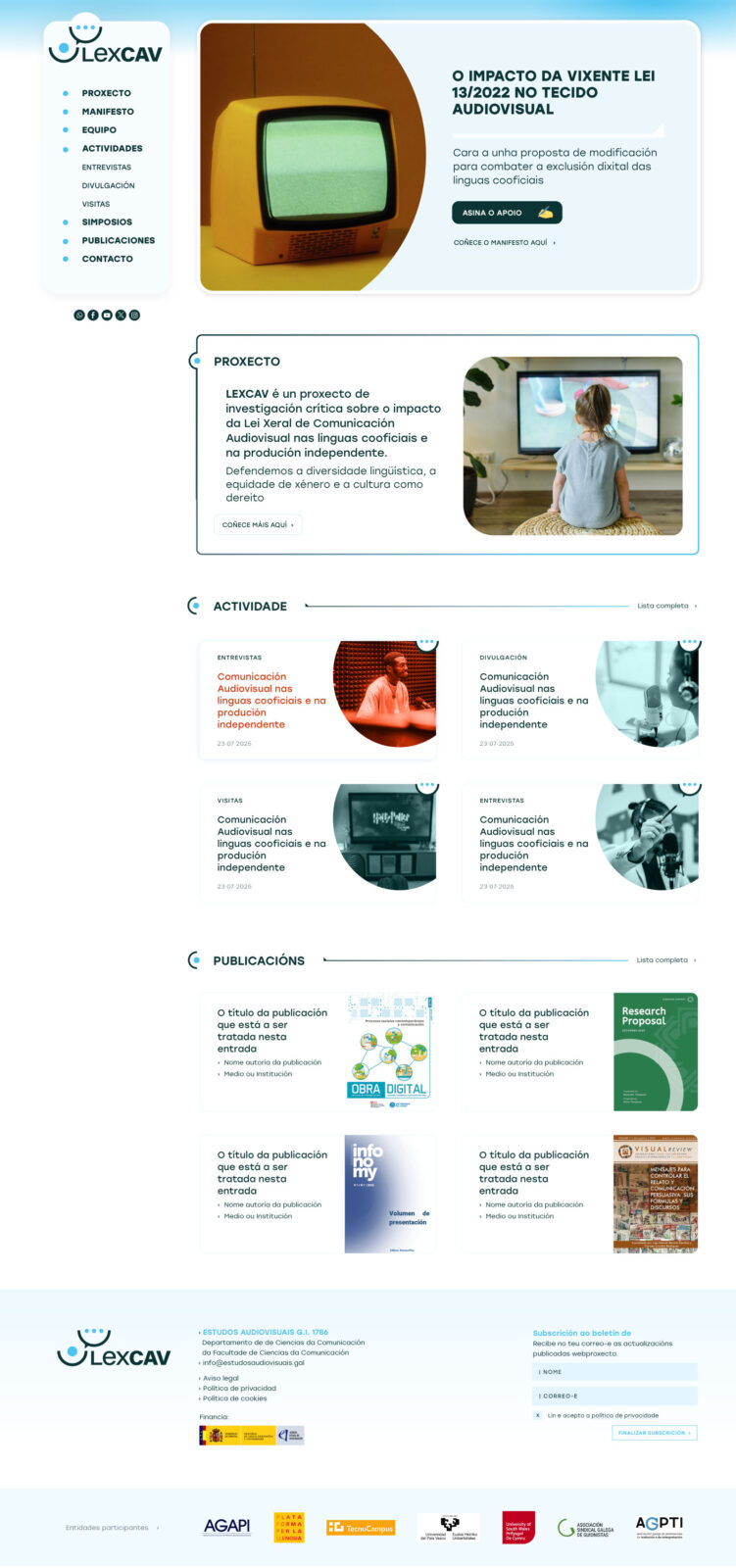 Site de apresentação para um projeto de investigação sobre o impacto da Lei Geral de Comunicação Audiovisual nas línguas cooficiais e na produção independente.